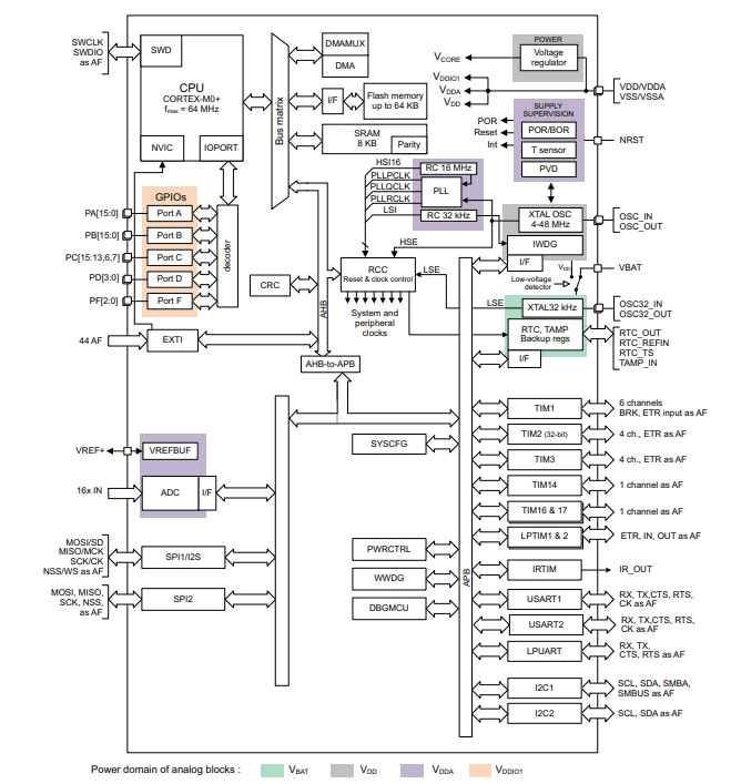 STM32G031F8P6包括存儲器保護單元(MPU)、高速嵌入式存儲器(8 KB SRAM和高達64 KB閃存程序存儲器,具有讀保護、寫保護、專有代碼保護和安全區域)、DMA、廣泛的系統功能、增強的I/O和外圍設備。