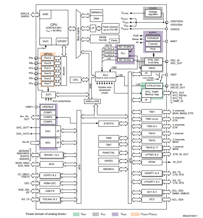 STM32G0B1RCT6包括存儲器保護(hù)單元(MPU)、高速嵌入式存儲器(144KB SRAM和512 KB閃存程序存儲器,具有讀保護(hù)、寫保護(hù)、專有代碼保護(hù)和安全區(qū)域)、DMA、廣泛的系統(tǒng)功能、增強(qiáng)的I/O和外圍設(shè)備。