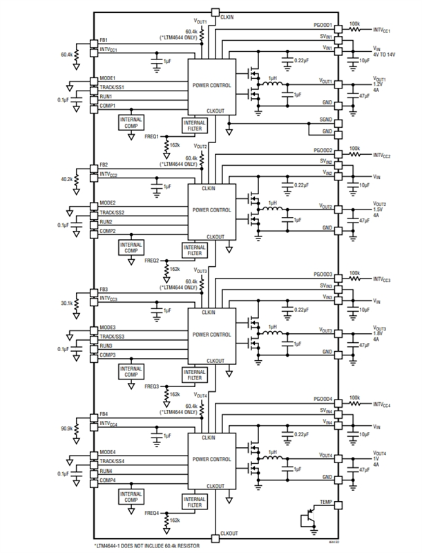 LTM4644IY#PBF外部偏置供電,輸入電壓范圍為4V~14V或2.375V~14V,輸出電壓范圍為0.6V~5.5V。其高效率的設(shè)計(jì)提供了每個(gè)通道4A連續(xù)(5A峰值)的輸出電流,只需要大量的輸入和輸出電容。