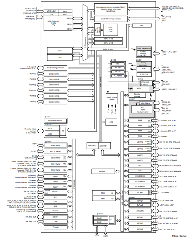 1、低功耗特性:采用了先進的低功耗架構和封裝技術,可在運行模式下實現超低功耗,延長設備電池壽命。同時支持多種低功耗模式,如待機模式、停機模式、備份模式等,可根據需求來選擇不同的模式進行功耗管理。