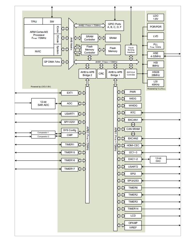 GD32F190R8T6提供多達5個通用16位定時器,一個通用32位定時器,一個基本定時器,一個PWM高級控制定時器,以及標準和高級通信接口:多達3個spi, 3個lc和2個usart, 2個IPS, 2個CAN2.0B與一個CAN PHY,和一個段LCD控制器。高級模擬外設包括一個12位ADC,兩個12位dac,三個運算放大器和兩個比較器。
