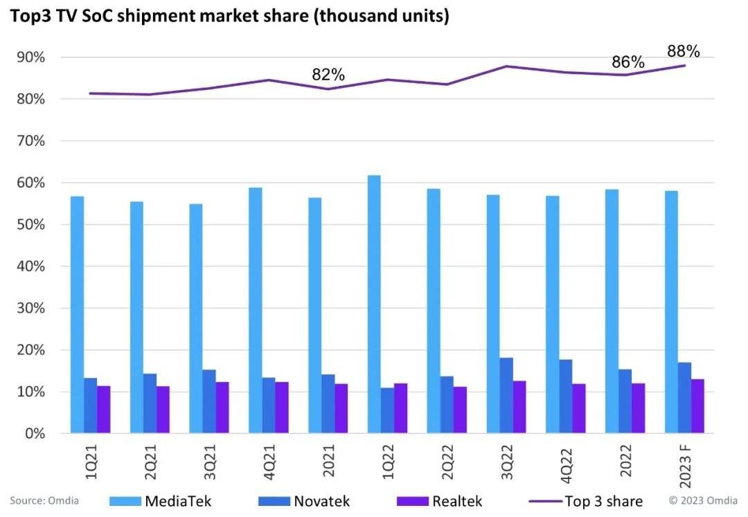 前三大電視芯片供應商之市場占有率將更為集中,預計2023年將達88%