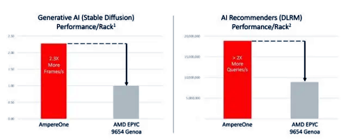 根據(jù)Ampere展示的產(chǎn)品性能對(duì)比,在生成式AI負(fù)載的文本提示生成圖像模型Stable Diffusion推理中,AmpereOne以每機(jī)架性能高出2.3倍優(yōu)勢(shì)領(lǐng)先AMD霄龍9654處理器。Ampere未提供與英特爾芯片對(duì)比數(shù)據(jù)。