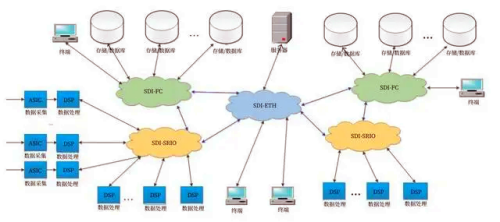 以數(shù)字信號處理系統(tǒng)為例,在實際應(yīng)用中經(jīng)常需要實現(xiàn)多種協(xié)議數(shù)據(jù)的接收、轉(zhuǎn)發(fā)、異構(gòu)協(xié)議數(shù)據(jù)轉(zhuǎn)發(fā)等功能,如下圖所示,邊緣的數(shù)據(jù)采集芯片將數(shù)據(jù)采集完成后,經(jīng)處理器處理后再通過RapidIO協(xié)議數(shù)據(jù)進行處理交換轉(zhuǎn)發(fā),轉(zhuǎn)發(fā)的數(shù)據(jù)可以存放到本地的存儲系統(tǒng)或者遠端的存儲系統(tǒng)中。其中本地存儲系統(tǒng)數(shù)據(jù)存放中,需要RapidIO協(xié)議與FC協(xié)議之間的轉(zhuǎn)換;遠端存儲系統(tǒng)數(shù)據(jù)存放中,則需要RapidIO協(xié)議、以太網(wǎng)協(xié)議、FC協(xié)議三者之間的轉(zhuǎn)換,即不同邊緣節(jié)點處理后的數(shù)據(jù)有交換轉(zhuǎn)發(fā)的需求,各個專用網(wǎng)絡(luò)中都有數(shù)據(jù)交換轉(zhuǎn)發(fā)的需求。三種專用網(wǎng)絡(luò)交換芯片和三種協(xié)議轉(zhuǎn)換的橋接芯片的使用,增加了系統(tǒng)的維護難度。基于SDI3210芯片支持多協(xié)議融合的特性,將該系統(tǒng)中所有的協(xié)議轉(zhuǎn)換和數(shù)據(jù)交換的芯片全部升級為SDI芯片,與DSP/CPU/FPGA、存儲節(jié)點、服務(wù)器等不同協(xié)議類型的處理節(jié)點相連,即可實現(xiàn)一種SDI板卡替換原有裝備中的三種不同協(xié)議和功能的網(wǎng)絡(luò)交換板卡,極大的縮短了研發(fā)周期,降低了產(chǎn)品成本,簡化了系統(tǒng)譜系。