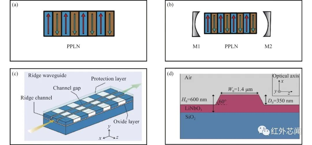 圖4 可用于實(shí)現(xiàn)頻譜遷移探測的不同光學(xué)結(jié)構(gòu)。(a)體塊晶體;(b)諧振腔中的體塊晶體;(c)脊型波導(dǎo)結(jié)構(gòu);(d)納米鈮酸鋰薄膜波導(dǎo)