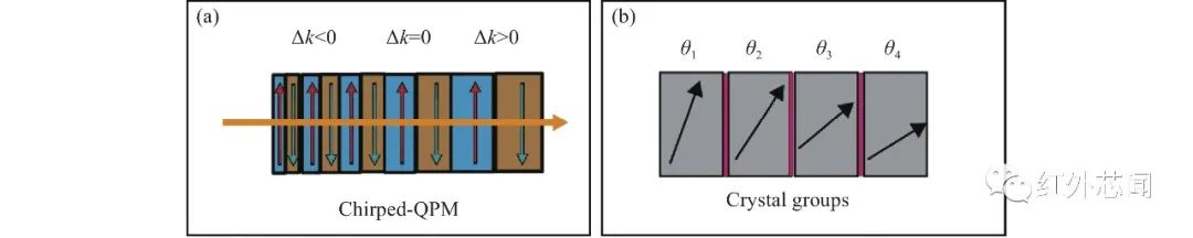 圖5 不同方式實(shí)現(xiàn)大接收帶寬頻譜遷移。(a)啁啾極化晶體;(b)多個不同切割角的晶體膠合在一起