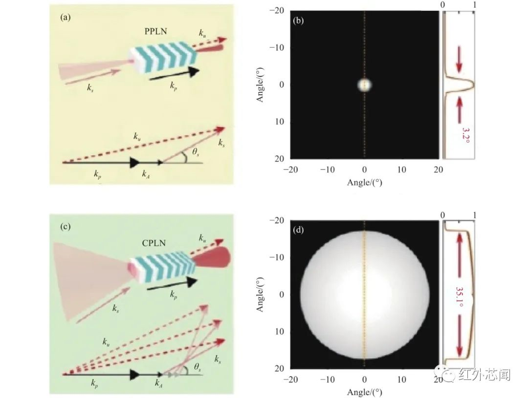 對于結(jié)構(gòu)光場或者圖像的頻譜遷移探測需要使用體塊晶體。空間帶寬主要受限于晶體橫截面的尺寸和相位匹配函數(shù)。在晶體尺寸確定的情況下,增加空間帶寬的主要手段是調(diào)控相位匹配函數(shù)。增加相位匹配函數(shù)對于入射角大小的容忍度即可增加空間帶寬,與增加頻率帶寬相似,主要方法也包括溫度梯度法、寬譜泵浦方法、啁啾極化和非共線準(zhǔn)相位匹配。主要進(jìn)展包括:2018年,R. Demur等人通過寬譜泵浦,相對于窄帶單頻泵浦,視場角提升了3倍多,有效像素點(diǎn)增加了10倍;2022年,基于啁啾極化的方式,曾和平教授研究組在中紅外波段實(shí)現(xiàn)了約30°的頻譜遷移成像視場角(如圖6所示)。