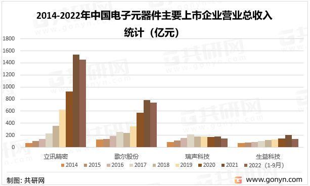 2014-2022年中國(guó)電子元器件主要上市企業(yè)營(yíng)業(yè)總收入統(tǒng)計(jì)(億元)