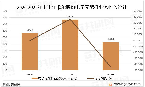 2020-2022年上半年歌爾股份電子元器件業(yè)務(wù)收入統(tǒng)計(jì)