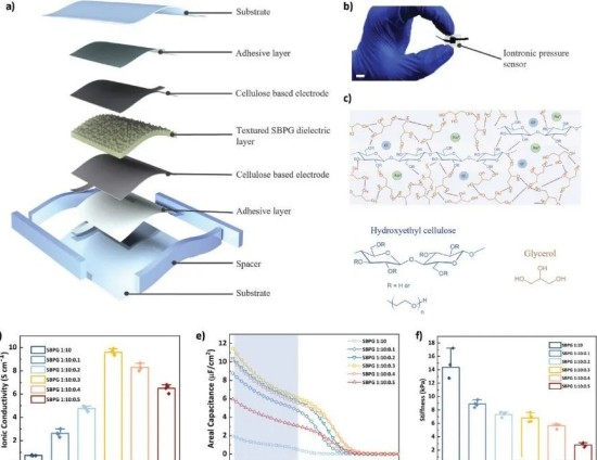 在這項工作中,研究人員發(fā)現(xiàn),具有優(yōu)異電化學性能和高剛度的介電層是實現(xiàn)離電式壓力傳感器高性能的關(guān)鍵條件。通過廣泛的化學和電化學表征,研究人員優(yōu)化設計了離電式壓力傳感器的介電層。介電層由基于羥乙基纖維素(HEC)、甘油和氯化鈉(NaCl)的超分子生物聚合物凝膠構(gòu)成,HEC和甘油分子的自組裝經(jīng)過優(yōu)化,可獲得最高可能性的離子電導率(9.85 × 10?? S/cm)和具有足夠剛度的面電容。傳感器介電層的這一根本性突破,使得制備業(yè)界領(lǐng)先的超靈敏離電式壓力傳感器成為可能。