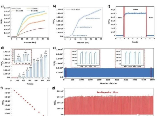 這項研究工作制備的離電式壓力傳感器具有前所未有的靈敏度(1475000 kPa?1)和穩(wěn)定性,傳感器峰值工作功率為4 μW。在16 kPa壓力下,傳感器的響應和恢復時間分別為63 ms和35 ms。在1 ~ 30 kPa的各種循環(huán)載荷下,傳感器展示出良好的可重復電容響應特性。該傳感器可以成功解析1 ~ 2 Pa的微小壓力以及50 ~ 100 Pa的中等壓力。通過壓縮循環(huán)測試和彎曲循環(huán)測試,驗證了該傳感器的機械穩(wěn)定性和信號穩(wěn)定性。此外,在不同的相對濕度條件下,該傳感器表現(xiàn)出非常穩(wěn)定的壓力響應。
