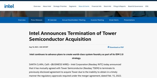 北京時間8月16日下午,芯片巨頭英特爾(Intel,NASDAQ:INTC)宣布,由于無法獲得以色列芯片制造公司高塔半導(dǎo)體(Tower Semiconductor,NASDAQ:TSEM)公司的股份,其已與高塔半導(dǎo)體雙方達(dá)成一致,終止之前2022年2月披露的收購協(xié)議。